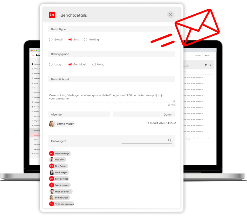 De berichtmodule van Idenfit werkt als een intern chatsysteem. Berichten kunnen worden verzonden via web of mobiele app met opties voor SMS, e-mail of pushnotificaties. Inhoud kan ook worden aangepast voor verschillende doelgroepen.