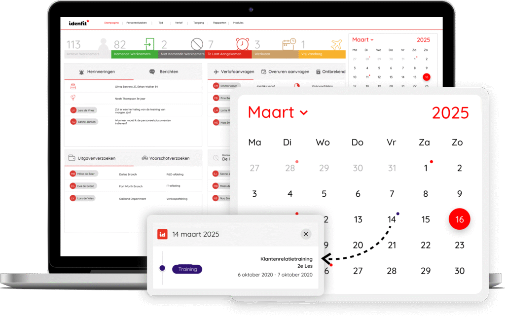Plan en creëer vergaderingen, evenementen, meldingen of notities en ontvang herinneringen over aankomende activiteiten op de Idenfit bedrijfskalender!