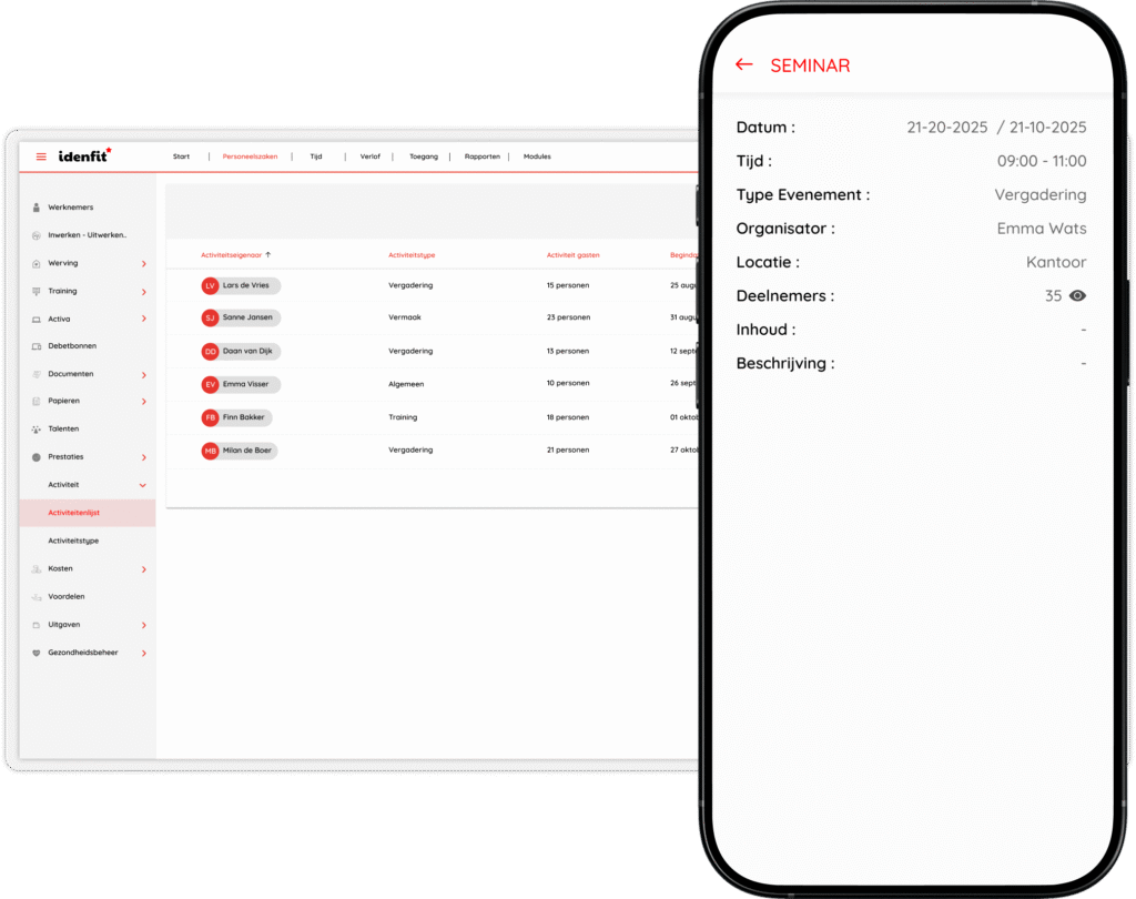 Ja, dat kan. Alle vergaderingen en evenementen kunnen worden vastgelegd in de Idenfit bedrijfskalender. Herinneringen, deelnemers en sessiedetails kunnen vanaf één scherm worden beheerd.