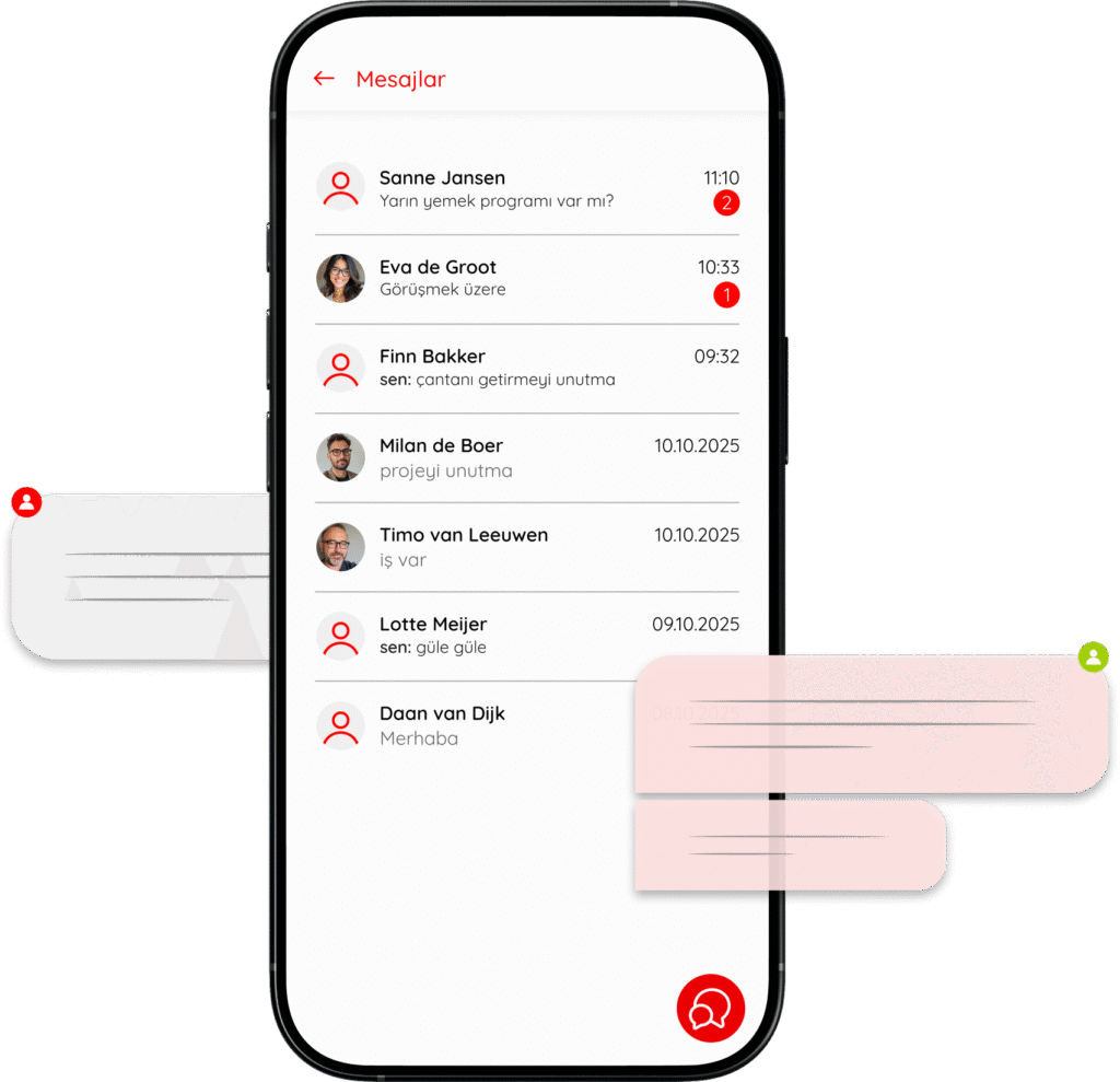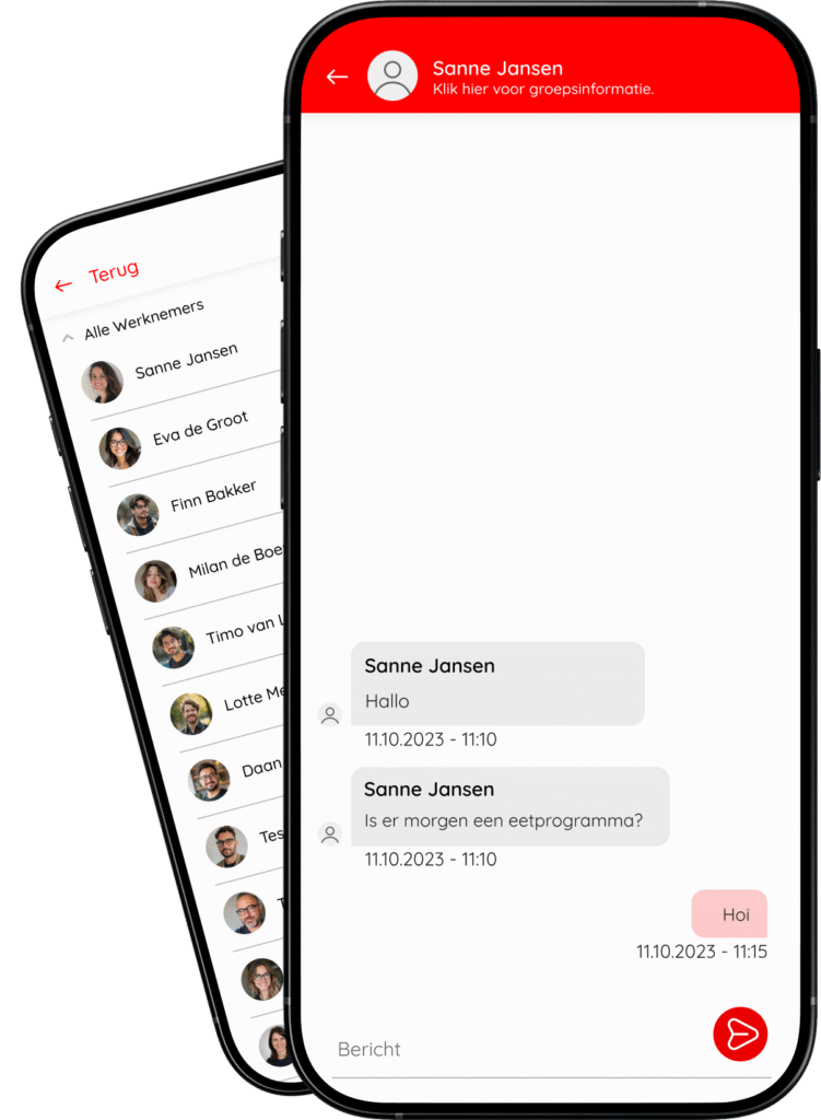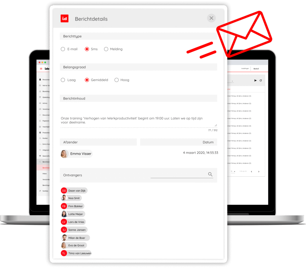 De berichtmodule van Idenfit werkt als een intern chatsysteem. Berichten kunnen worden verzonden via web of mobiele app met opties voor SMS, e-mail of pushnotificaties. Inhoud kan ook worden aangepast voor verschillende doelgroepen.
