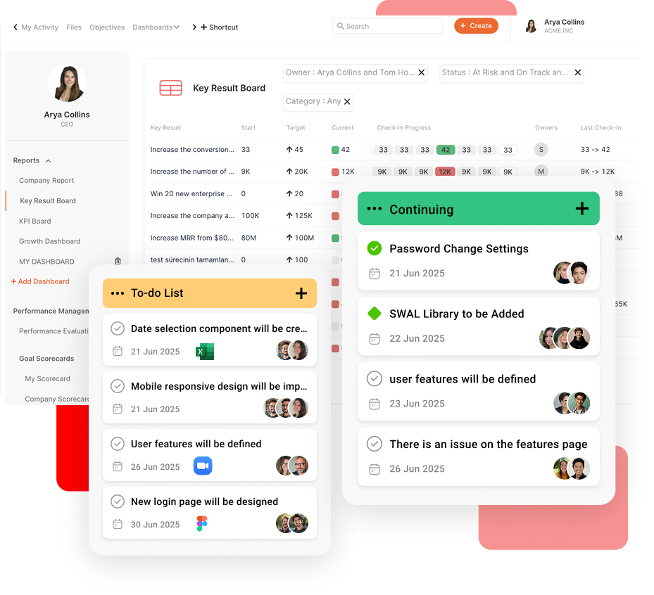 Zet uw strategische doelen om in tastbare resultaten met behulp van OKR- en KPI-methodologieën.